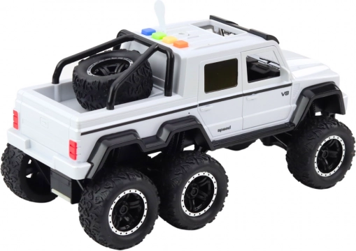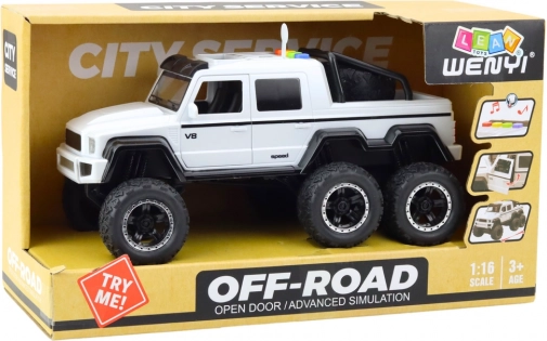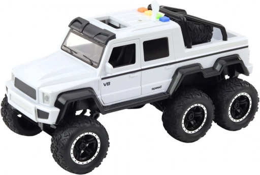 Modellen har 6 massive hjul med mønstrede dæk, som øger stabiliteten og gør det muligt at overvinde mindre forhindringer. På taget er der fire knapper, der aktiverer lydeffekter: lyde af motorstart, horn, bakning, sirene og fjernbetjening. Den har også åbne døre, der øger interaktionen og gør legen mere realistisk.