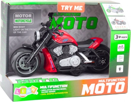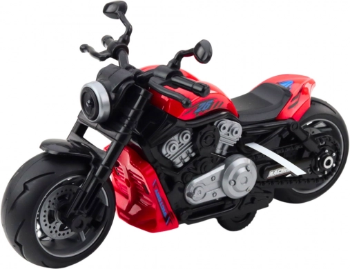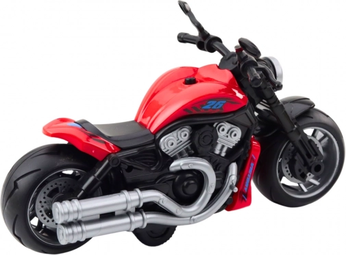 Motorcyklen er designet i en intens rød farve og lavet af høj kvalitets plast, der er modstandsdygtig over for daglig brug. Den er udstyret med brede hjul, en solid krop og ergonomiske håndtag, hvilket sikrer stabilitet og komfort under leg. Dens udseende er inspireret af klassiske enkeltsporede køretøjer, hvilket giver den autenticitet.