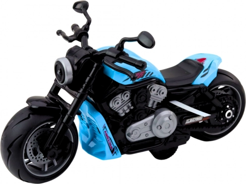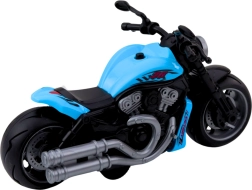 Børnemotorcyklen er designet i en markant blå farve og fremstillet af plast af høj kvalitet, som er modstandsdygtig over for daglig brug. Den er udstyret med brede hjul, solid konstruktion og ergonomiske greb, som sikrer stabilitet og komfort under legen. Motorcyklen efterligner et klassisk enkeltsporet køretøj med realistiske motor- og karrosseridetaljer, hvilket øger autenticiteten.