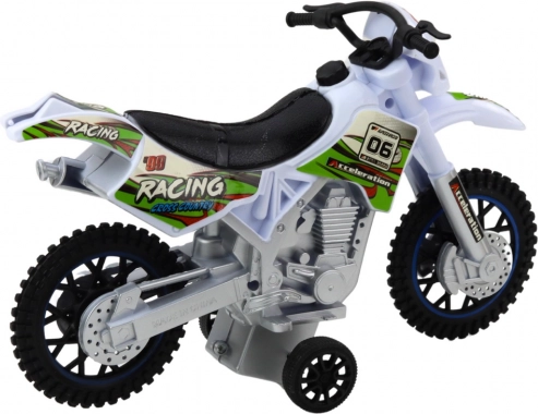 Denne motocrossmodel er lavet af holdbar plast, som tåler intensiv leg. Hvid-grøn design med racerstickers ser meget attraktivt ud. Store terrændæk sikrer stabilitet og bedre simulering af kørsel på ujævnt underlag.