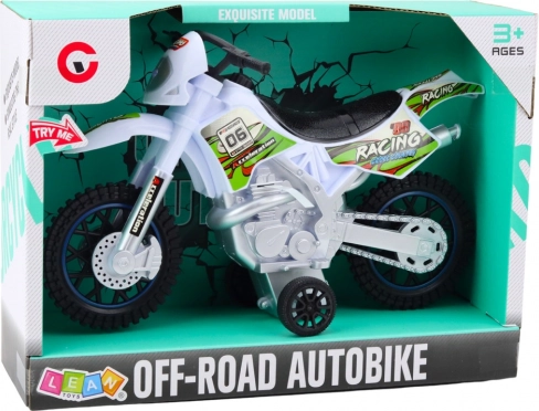 Kvalitets motocross hvid off-road med lys- og lydeffekter til små racerkørere. Ideelt legetøj til dynamiske oplevelser.