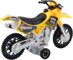 Denne motorcykel er lavet af holdbar plast, der tåler intensiv leg. Den gule farve og racerklistermærker giver et attraktivt udseende, mens de store terrændæk giver stabilitet på ujævne overflader.