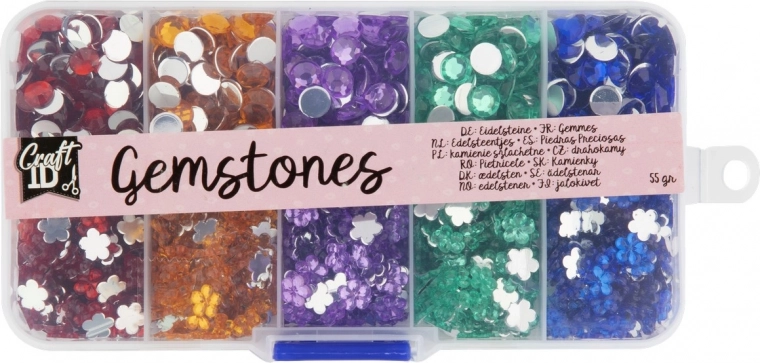 Opdag et smukt sæt med farvede ædelstene i en praktisk organizer. Dette sæt indeholder 10 forskellige dekorative sten i 5 farver og 2 former.