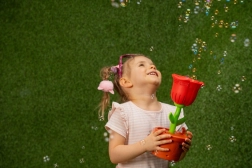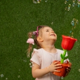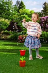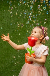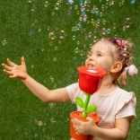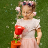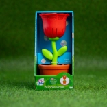 Denne boblemaskine formet som en rød rose i en potte vil begejstre alle børn, der elsker bevægelse og udendørs leg. Hæld blot væsken i, tænd, og se masser af glitrende bobler svæve omkring dig. LED-belysningen giver boblerne et særligt udtryk, især i skumringen og om aftenen.