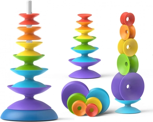 Dette lærende, sansebaserede legetøj kombinerer kreativ leg og færdighedstræning. Barnet kan stable 7 farvede skiver efter størrelse eller farve, lade dem glide ned ad spiralen og konstant afprøve nye kombinationer. Stablingstårnet understøtter finmotorik, hånd–øje-koordination og opfattelse af former og farver.