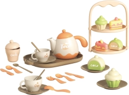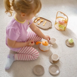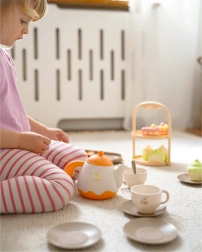 Tekande, kopper, underkopper, bakke og kageopsats – børn kan hælde te og servere lækkerier som ved en rigtig fest.