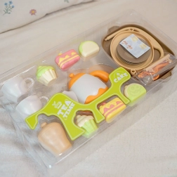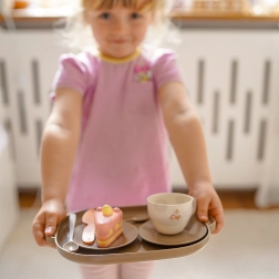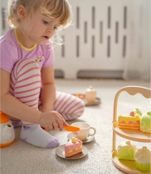 De lette, børnevenlige dele med runde kanter ligger godt i små hænder og stimulerer finmotorikken. Sættet i pastelfarver er ideelt til daglig leg og læring gennem rollen som vært og servering.
