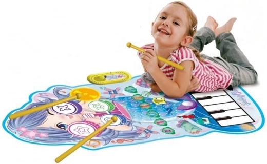 Denne farverige musikmåtte med eventyrligt havfruemotiv kombinerer et klaviatur med 8 tangenter og trommepads i én blød og holdbar spilleflade. Børn kan spille med fingrene eller de medfølgende trommestikker, udforske instrumentlyde, starte melodier og rytmer og skabe deres egne kompositioner.