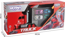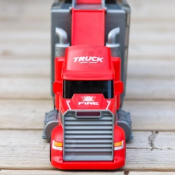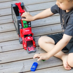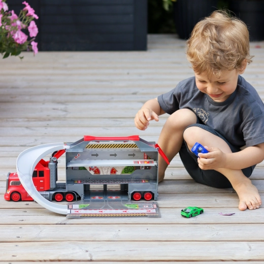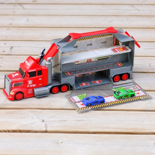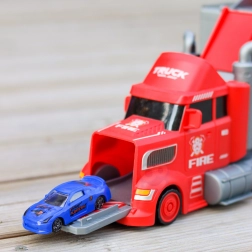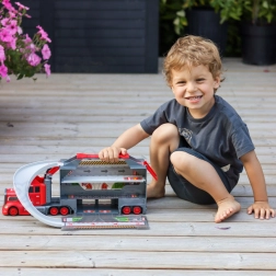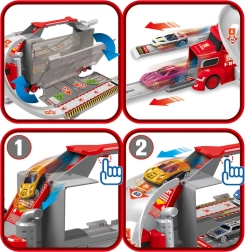 Denne multifunktionelle lastbil i et attraktivt brandmandsdesign fungerer som en transporttrækker, og når den foldes ud, bliver den til et komplet legesæt med garage, parkeringspladser og en dynamisk bane. Takket være bilaffyreren kan børn starte løbene på et splitsekund.