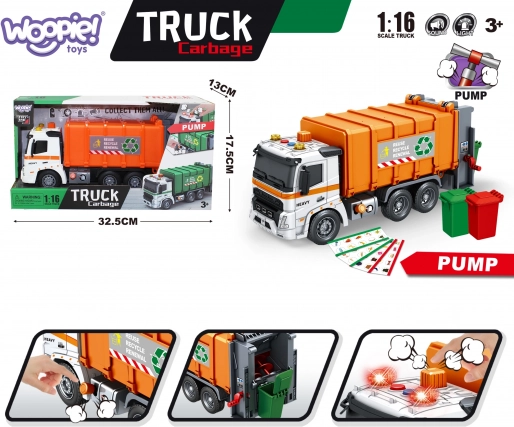 Skraldebilen Woopie tilbyder realistiske effekter i skala 1:16, som omfatter forskellige lydeffekter og funktionelle lys. Den indeholder et pneumatisk system til at løfte og sænke containeren og er fremstillet af holdbar og sikker plastik til børn. Køretøjets bagklap kan åbnes.