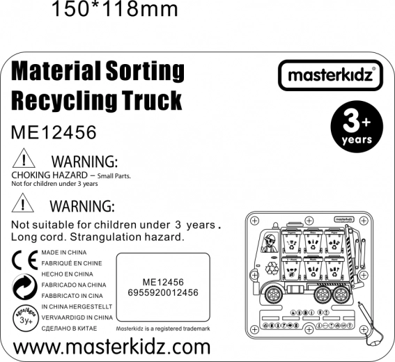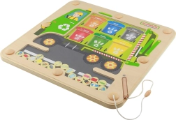 Denne unikke trætavle fra Masterkidz giver børn en fantastisk måde at lære grundlæggende affaldssortering. Med en magnetisk stav skal børn flytte små skiver med affald til de rigtige beholdere. Beholderne er placeret på en illustration af en stor grøn genbrugslastbil.