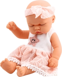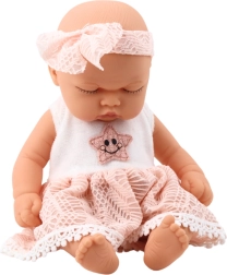 Dukken har kompakte dimensioner – ca. 24 x 12 cm, hvilket gør det nemt for små børnehænder at holde og samtidig passer den i de fleste dukkevogne og dukkesenge. Den stilfulde lyserøde kjole med fine blondekanter og en broderet stjerne i midten sammen med det matchende hårbånd danner et komplet outfit, der understreger legetøjets pigede og blide karakter.