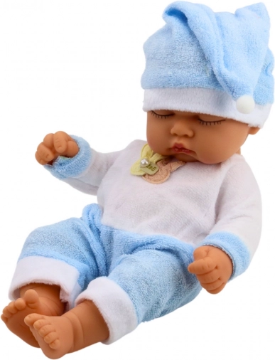 Babydukke i blåt pyjamas er en charmerende og realistisk legetøj, ideel til børn fra 3 år. De lukkede øjne, det rolige udtryk og de fine ansigtstræk minder om en lykkeligt sovende baby.