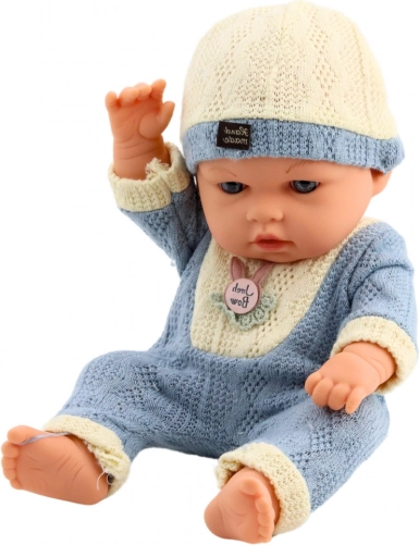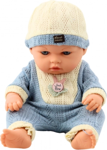 Dukken måler cirka 29 x 15 cm, hvilket gør den stor nok til at gøre indtryk, men samtidig let og nem at håndtere – ideel at holde i små hænder og passer nemt i de fleste børneklapvogne eller dukkesenge. Den er klædt i et blødt, strikket sæt i nuancer af lys creme og pastelblå, pyntet med en lille applikation.