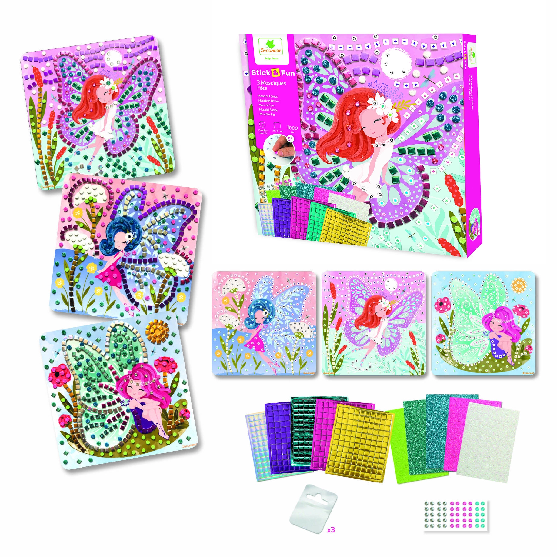 Børn vil være begejstrede for at skabe deres egne smukke mosaikbilleder med feer. Ved hjælp af selvklæbende sten og glitrende mosaikdele færdiggør de hvert billede, som derefter kan stråle med sin helt egen glans. Når de er færdige, kan børnene stolt udstille billederne med de medfølgende gennemsigtige ophæng.