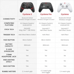 Oplev præcis styring og topydelse med GameSir Cyclone 2-controlleren. Den tilbyder tre-tilstandstilkobling (2,4 GHz, Bluetooth, kabel), Mag-Res TMR-sticks, analoge aftrækkere med Hall-effekt, 6-akset gyroskop, immersive vibrationer og RGB-baggrundsbelysning til SWITCH, PC, Android og iOS.