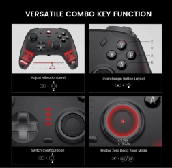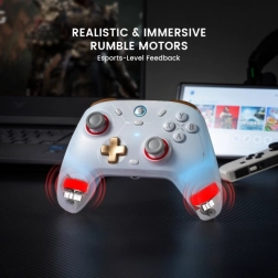 Takket være tre-tilstandstilkobling (2,4 GHz, Bluetooth, kabel) vælger du nemt den ideelle spilmetode med minimal latenstid. Det 6-aksede gyroskop understøtter bevægelsesstyring på SWITCH, asymmetriske vibrationsmotorer giver realistisk feedback, og e-sport forreste knapper med mikrokontakter sikrer hurtige og sikre tryk. Tilpasningsbare RGB-effekter og hurtig profilskift giver både stil og fleksibilitet i spillet.