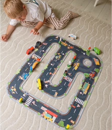 Dette træsæt er ideelt til udvikling af finmotorik, fantasi og sociale færdigheder. Børn kan skabe deres egne byer, scener og situationer i trafikken, lære at genkende køretøjer og skilte og naturligt forstå principperne for sikker adfærd i trafikken.