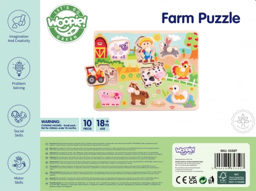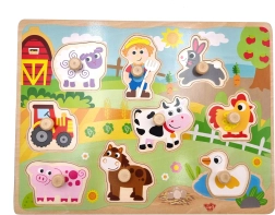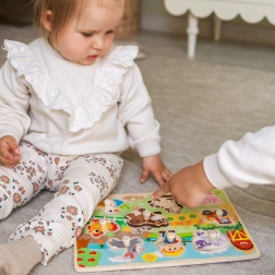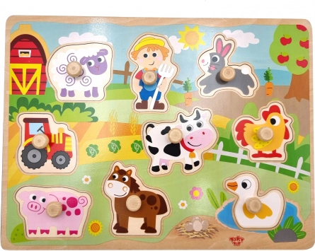 Dette træpuslespil med knopgreb er en fremragende hjælper til den første læring og selvstændig leg. Hver brik passer præcist i det fræsede hul på pladen, så barnet nemt træner logik, tålmodighed og korrekt matchning af former. De klare illustrationer af gården indbyder til opdagelse og sjov hver dag.