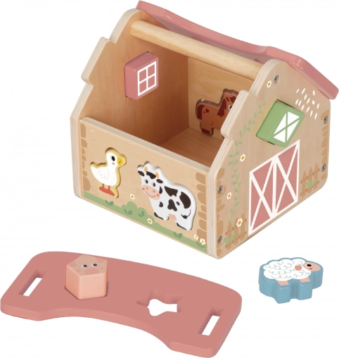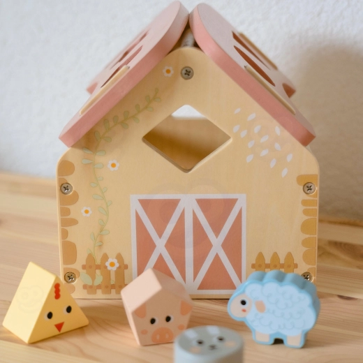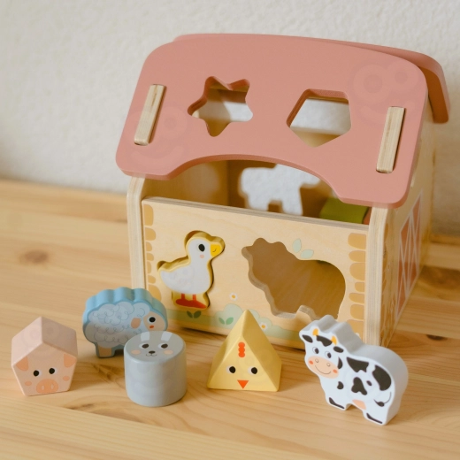 Taget åbnes nemt for enkel udtagning af dele og opbevaring. Omhyggeligt forarbejdede træelementer med afrundede kanter sikrer sikker leg. Sættet indeholder et udvalg af dyr (ko, får, hest, gås) og trykte former, som understøtter udvikling af ordforråd og fantasi.