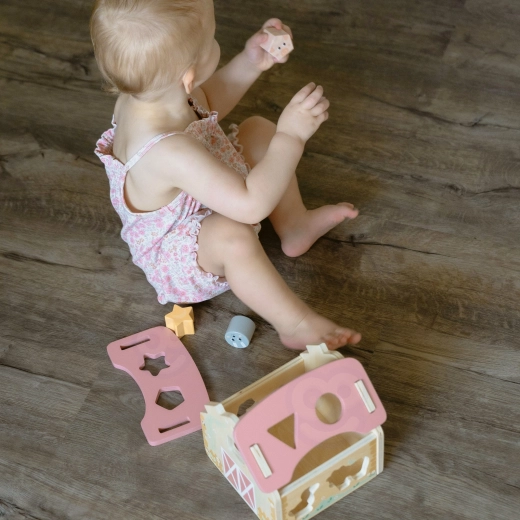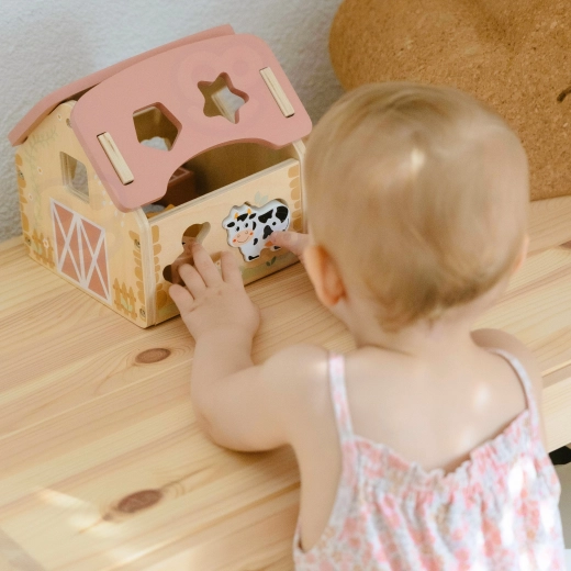 Børn træner øje–hånd-koordination og lærer former og farver ved at lægge dyrene og de geometriske klodser i de rigtige huller.