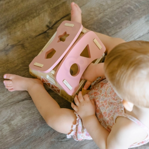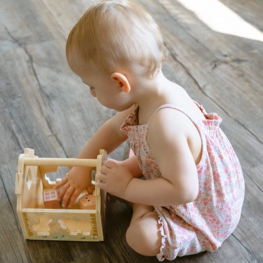 Den søde trælade med udskæringer til dyr og former motiverer børn til aktiv leg og naturlig læring. Ved at indsætte de rigtige dele øver børn tålmodighed, koncentration og forståelse for årsag og virkning. Det pastelfarvede, naturlige design passer perfekt i børneværelset.
