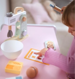 Oplev magien ved bagning med en træmixer i blide pastelfarver, som lader børn efterligne de voksnes verden. Fra at dreje på knappen til at røre i skålen – realistiske detaljer og sikre afrundede elementer i kvalitets-træ gør den til et ideelt supplement til ethvert legekøkken.
