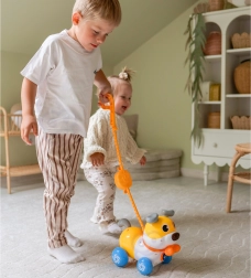 Den søde interaktive hund fra WOOPIE er en fantastisk makker til de første skridt og til daglig leg. Takket være funktionen 2-i-1 – skubbe og trække tilpasser den sig nemt barnets tempo, mens den gør vov-lyde og afgiver glade lyde. Det elastiske håndtag sikrer jævn bevægelse i alle retninger, og de roterende ører og hale 360° stimulerer nysgerrighed og koordination. Der medfølger også et sødt ben til “fodring”, som udvikler fantasi og rolleleg.