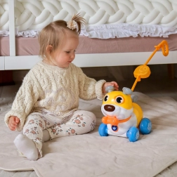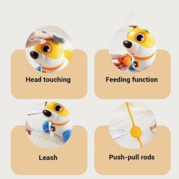 Hunden gør og laver realistiske lyde, reagerer på berøring og viser sin glæde efter “fodring” med det medfølgende ben. Roterende ører og hale 360° øger den sensoriske stimulering, mens det elastiske håndtag giver en jævn glidning på gulvet uden at hænge fast – både hjemme og på tæppe.