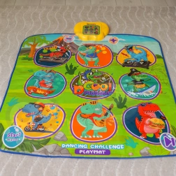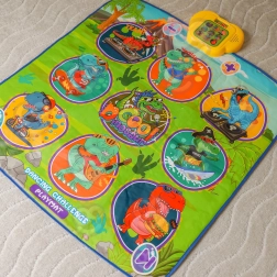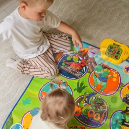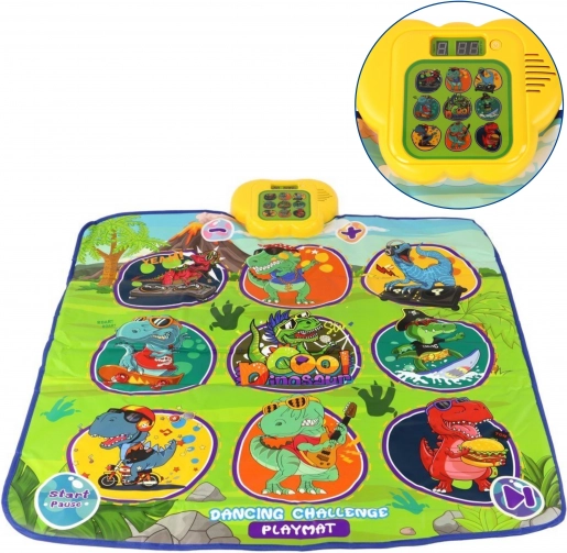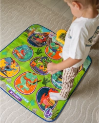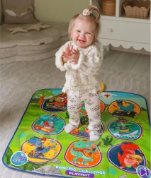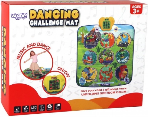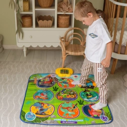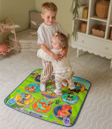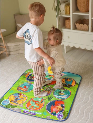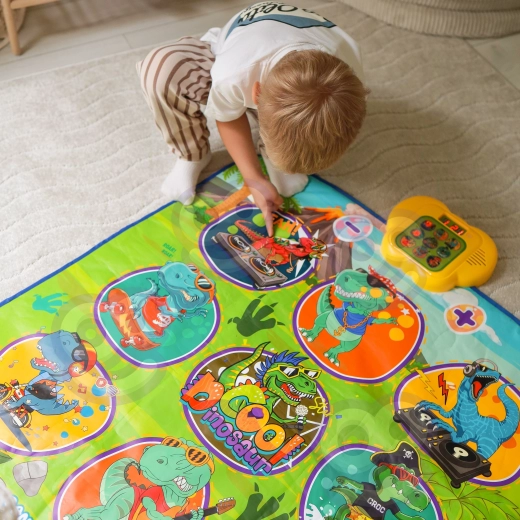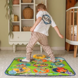 Den glade dansemåtte med dinosaurer motiverer børn til bevægelse og interaktiv læring. Ni store, farverige felter reagerer på berøring, og trinvejledningen sikres af kontrolenheden, som på en sjov måde understøtter koordinationsevner, rytmesans og høreevne. Den bløde konstruktion er behagelig at træde på og sikker til daglig leg.