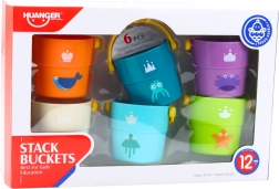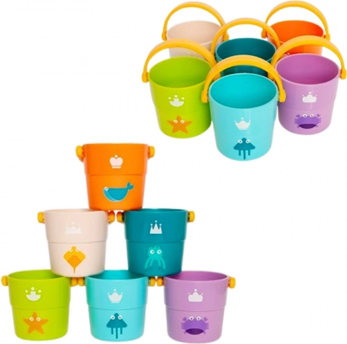 Sættet med farvede spande er et fremragende valg til små børn fra 12 måneder. Det indeholder 6 lette og farverige spande dekoreret med havmotiver, som kan stables oven på hinanden eller bruges i badet. Takket være de forskellige farver, former og mønstre stimulerer sættet effektivt barnets sanser og motiverer til kreativ leg.