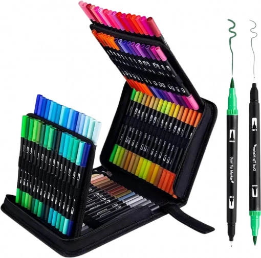 Slip din kreativitet løs med et sæt på 120 farvede tuscher, der opfylder behovene hos enhver kunstner, studerende eller hobbyentusiast. Det dobbeltsidede design på hver tusch tilbyder forskellige spidsbredder: en fin til præcise detaljer og en bredere til farvelægning og udfyldning af større flader.