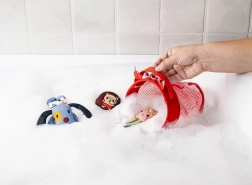 Legetøjet er designet ikke kun til sjov i badet, men også til udvikling af koordination og fantasi hos barnet. Det praktiske håndtag gør det nemt at holde og hænge legetøjet op til let tørring. Efter hver brug anbefaler vi at skylle med rent vand og tørre af. Legetøjet kan maskinvaskes ved 30°C på skånsomt program.