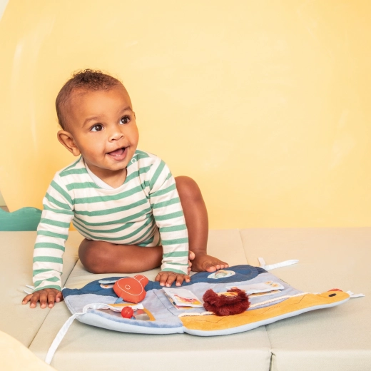 Bærbart tekstilpanel med hunden Jules tilbyder mange aktiviteter og stimuli for de allermindste, vækker deres nysgerrighed og udvikler sanserne.