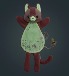 Plys hånddukke i form af en kat, der lyser i mørke og giver barnet en følelse af tryghed.