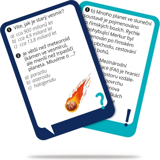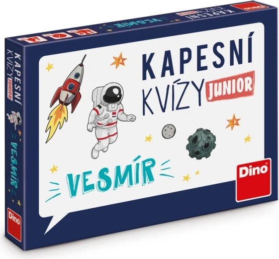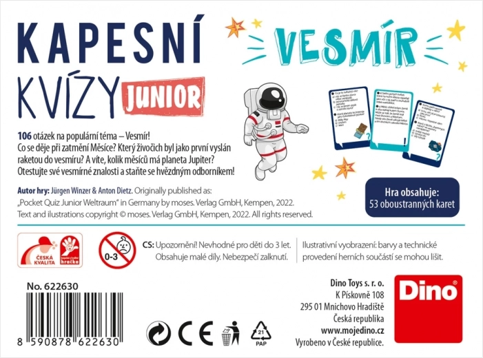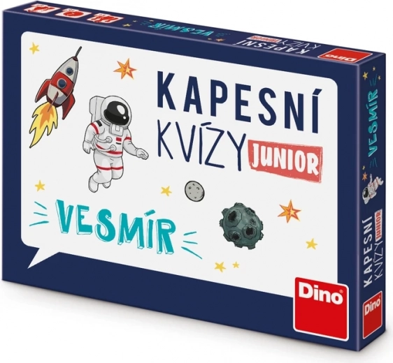 Oplev det fascinerende kosmos med en lommevidensquiz for børn fra 8 år. Der venter 106 spørgsmål om rummet på 53 dobbeltsidede kort med dansk tekst. Ideel underholdning til både rejser og hjemme, som udvikler viden og nysgerrighed og samtidig er hurtig og let at spille. Spillet har udmærkelsen Sikker og kvalitetslegetøj og er fremstillet i Tjekkiet.