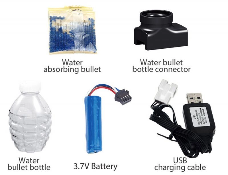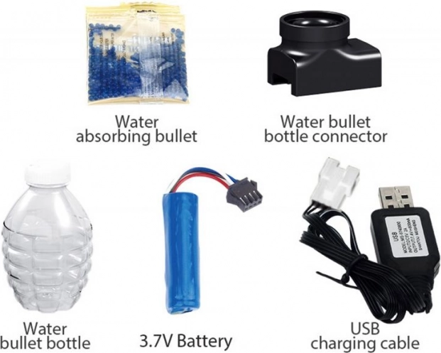 I pakken finder du blaster, magasin, beskyttelsesbriller, genopladeligt batteri og USB-kabel. Hydrér bare kuglerne, og så er du klar til at spille.