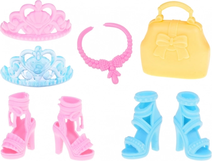 To elegante par højhælede sko tilføjer charme og stil til det samlede look. Tilbehør som en stilfuld håndtaske, en lyserød halskæde og to kroner er perfekte til enhver lille prinsesse.