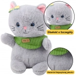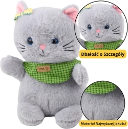Denne plyskat er en fantastisk ledsager for børn takket være sin blødhed og sødme. Den er lavet af blød grå plys, som er sikker for børn og behagelig at røre ved. Hovedpynten omfatter et grønt tørklæde og en gul sløjfe, hvilket giver et unikt præg.