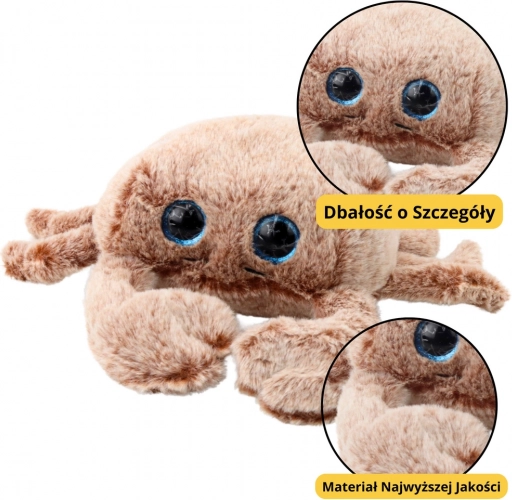 Denne plyskrabbe er den perfekte ven for alle, der elsker havets dyr. Den er lavet af blød beige plys, som ikke kun ser indbydende ud, men også føles komfortabel. Den smukke afrundede form, de store strålende øjne og de realistisk udformede kløer og ben giver den et charmerende udseende.