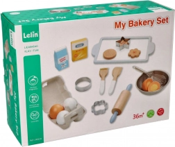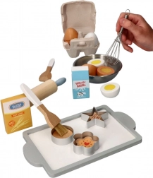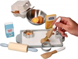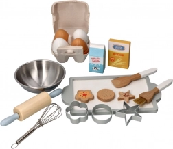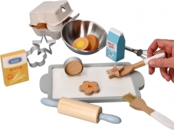 Kagerulle, piskeris, pensler, udstikkere og skål gør det muligt for børn at efterligne rigtig bagning og øve håndtering af redskaber.