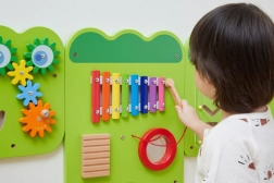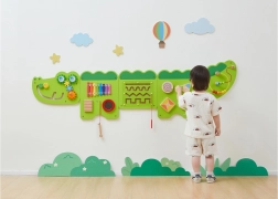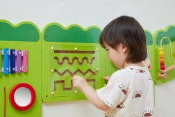 Hvert panel tilbyder en anden aktivitet – fra at spille på xylofon over at dreje tandhjul og mønstrede skiver til at føre perler og flytte brikker i labyrinter. Børn øver naturligt koordination, greb, tålmodighed og problemløsning. Vægmontering sparer plads og muliggør, at flere børn leger samtidig.