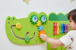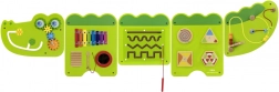En sjov træbaseret vægmonteret tavle formet som en krokodille giver børn fra 18 måneder timevis af sanselege og træning af finmotorik. Den byder på xylofon, tandhjul, labyrint, skubbe- og drejeelementer samt perler på wire, som udvikler hånd–øje-koordination, logisk tænkning og musikalsk sans. Takket være vægmontering sparer den plads og er ideel til børneværelser, daginstitutioner og legehjørner.