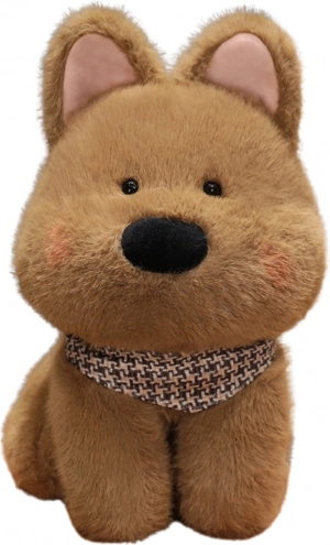 Den brune plysbamse-hund er en utroligt sød legetøj, der straks vækker sympati. Den er designet med omhu og kendetegnes ved sin bløde pels, store sorte snude og fine rødlige kinder. De søde sorte øjne og stående ører giver en særlig charme, som understreges af det flotte tørklæde i en brun nuance.
