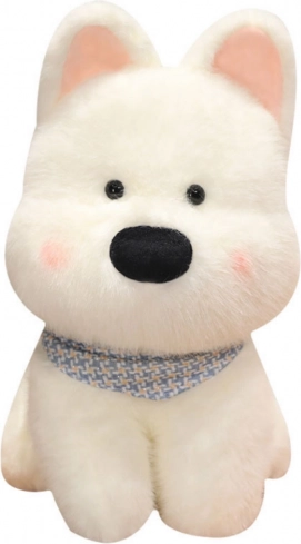 Plyshvalpen kendetegnes ved blød hvid pels og sorte øjne, som giver den et ekstra nuttet udtryk. Det samlede design er fuldendt med et dekorativt tørklæde i blå nuancer, der understreger dens venlige karakter.