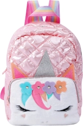 Modellen er fremstillet af et let, men holdbart materiale, der er modstandsdygtigt over for snavs og skader. Forsiden er pyntet med en filtapplikation af en enhjørning, blomster med ører og et glitrende horn. Rygsækken har et rummeligt hovedrum, en mindre indvendig lomme og en udvendig lynlåslomme for nem organisering. Justerbare stropper sikrer komfort og tilpasning til barnets højde.