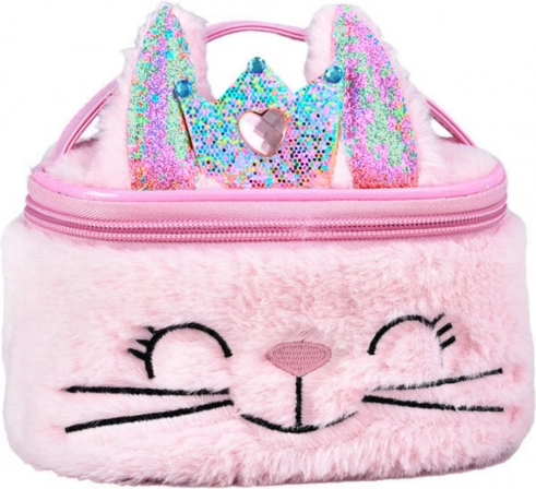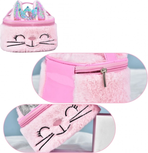 Denne kosmetiktaske med kaninmotiv er ikke kun smuk, men også praktisk. Den er lavet af kvalitetsplys kombineret med glitrende syntetisk materiale og er ideel til opbevaring af småting, hårspænder, elastikker, kosmetik eller andre skatte.