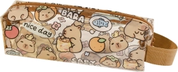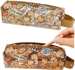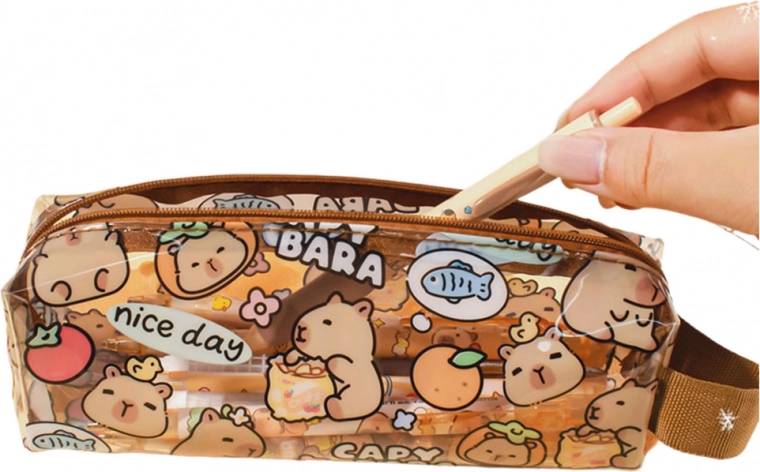 Dette skolepenalhus er lavet af holdbart, vandafvisende PVC, hvilket gør det perfekt til daglig brug i skolen og i fritiden. Det gennemsigtige materiale med farvet print gør det let at se indholdet. Penalhuset har et brunt sideløkkehåndtag for nem transport.