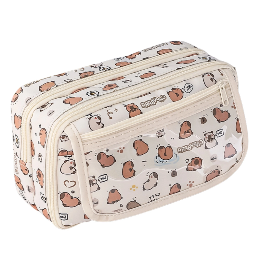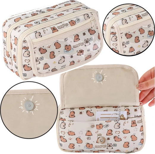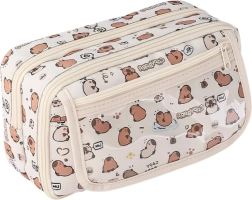 Et stort og funktionelt penalhus med motiv af kapivarer er ideelt til elever, der værdsætter praktisk anvendelighed og et charmerende design. I cremefarve med tryk af hyggelige kapivarer skiller penalhuset sig ud blandt andre skoleartikler. Det egner sig til skole, universitet, billedkunsttimer eller hjemmekontor.