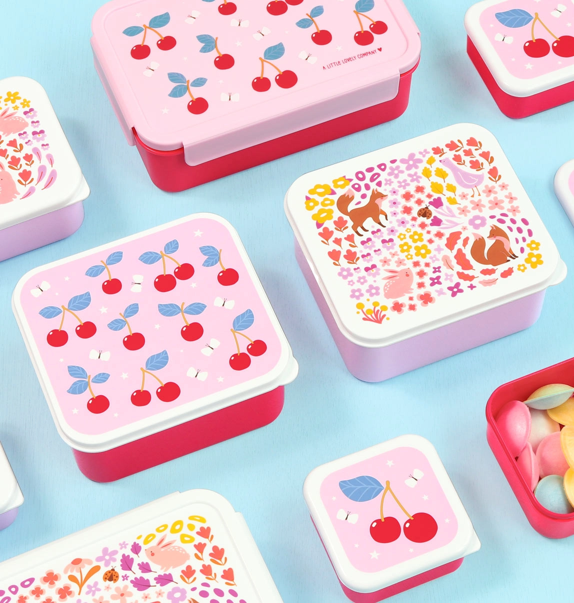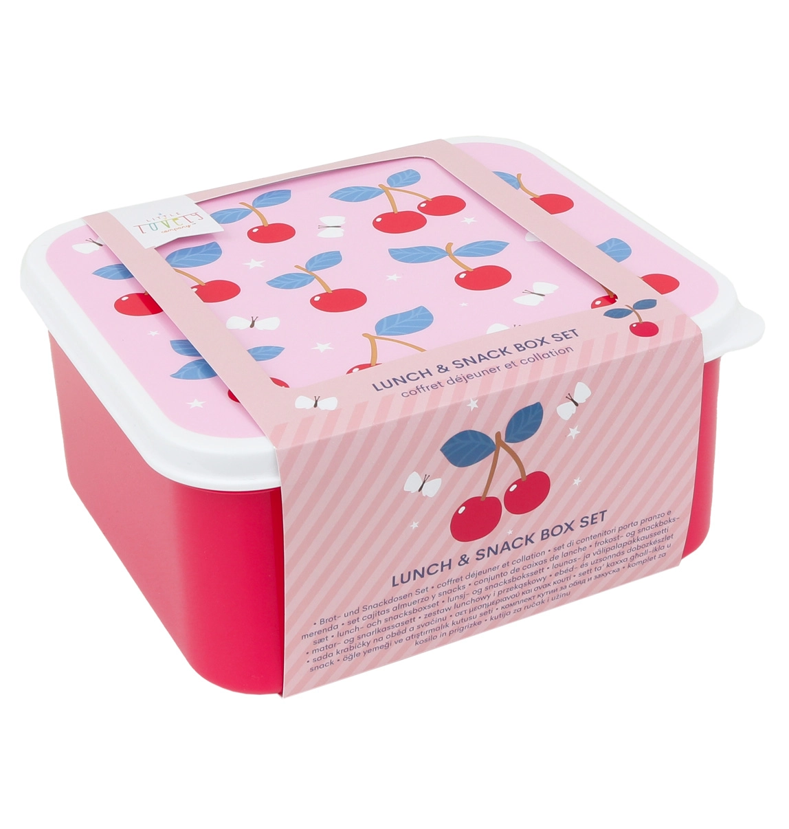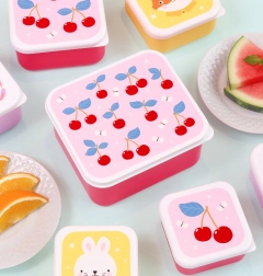 Dette sæt madkasser er ideelt til daglig brug takket være de fire forskellige størrelser, som kan stables i hinanden for praktisk opbevaring. Kirsebærdesignet giver dine frokoster og snacks et sjovt og venligt udtryk. Bemærk, at disse bokse ikke er egnede til opvaskemaskine eller mikroovn. Vask alle beholdere i varmt sæbevand før første brug.